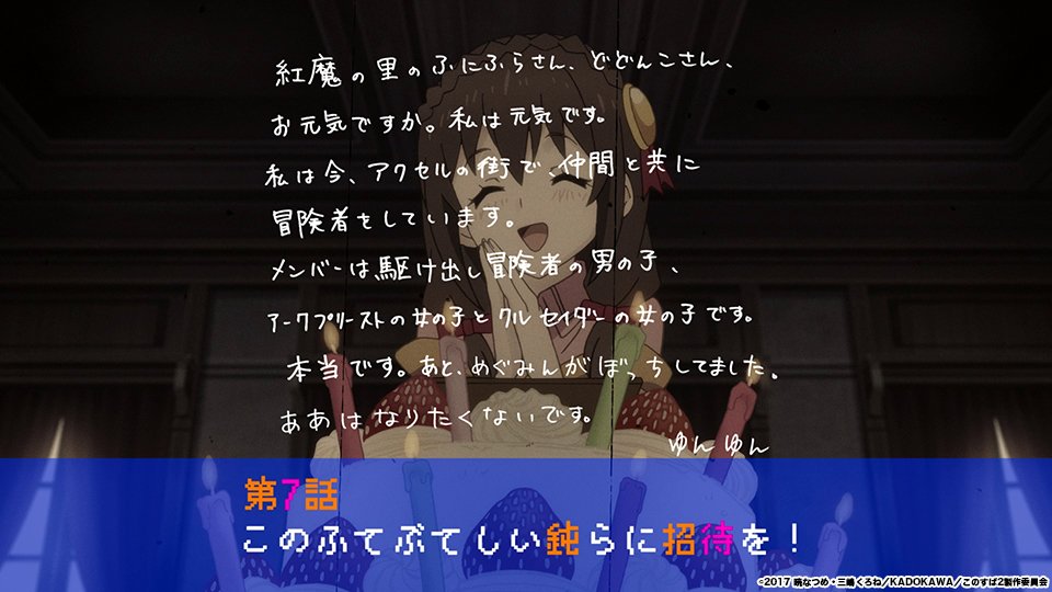 本日2/22(水)に放送される『この素晴らしい世界に祝福を!2』第7話の次回予告が公式サイトにて公開中。2週連続「ゆんゆん」!!「めぐみんがぼっちしてました。ああはなりたくないです」。 最速放送は「TOKYO MX」より25:05~、お見逃しなく!!