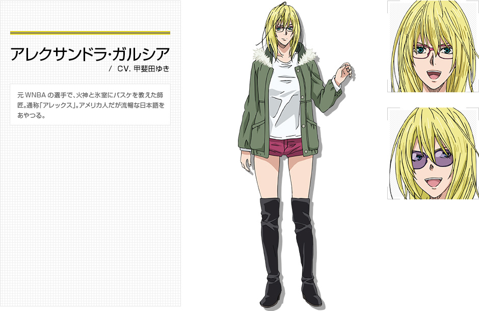 バスケットボールの超強豪校「帝光中学校」。部員数は100人を超え、全中連覇を伸ばすこの部の歴史に「無敗」を誇った10年に1度の天才が5人同時にいた世代がいた。この世代は「キセキの世代」と呼ばれ、高校に進学してからも彼らはそう呼ばれ賞賛され続けている。しかし、その「キセキの世代」には奇妙な噂があり、誰も知らず、試合記録もない、しかし天才5人が一目置いた「幻の6人目」の選手がいたと。創設2年目を迎えた「私立誠凛高校」の男子バスケットボール部にその「幻の6人目」の「黒子テツヤ」、アメリカ帰りの大型新人「火神大我」が入部した。自らを「影」と称する「黒子」に対し、「火神」が「光」となって「キセキの世代」を倒し日本一になると決め、物語は動いていくのである。アメリカにいた時「火神」にバスケットボールを教えた師匠が「アレクサンドラ・ガルシア」である。アメリカの大学バスケの州チャンピオンであり、WNBAでも活躍していたが病気が原因で引退。事実を受け入れられず荒れていた時に「火神」とその兄貴分「氷室辰也」に弟子入りを志願された。最初はしぶしぶだったが、徐々にバスケの楽しさを思い出し笑顔を取り戻した。日本語が流暢であり非常に奔放な性格。金髪にメガネ、身長180cm、スタイルも抜群で美人な彼女にぜひバスケを教わってみたいものである。