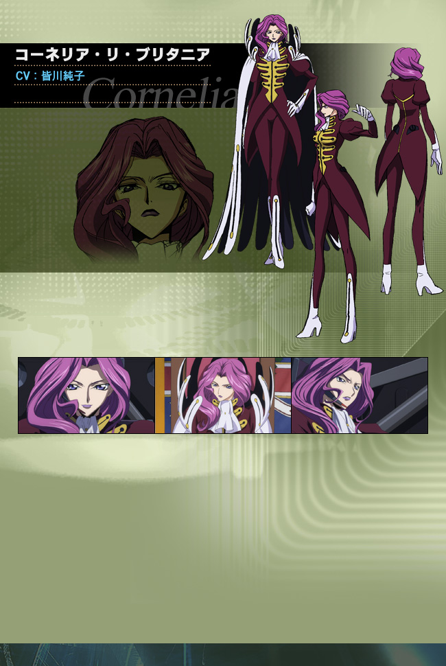 皇暦2010年。日本は「神聖ブリタニア帝国」に占領され、植民地とされた。日本は「エリア11」と呼ばれ「自由」「権利」「名前」を奪われた。それから7年--。日本に住むブリタニア人の少年「ルルーシュ・ランペルージ」は謎の少女「C.C.(シーツー)」から他人に自分の命令を強制出来る力「ギアス」を授けられた。暗殺された母の仇をとり、妹の「ナナリー」が安心して暮らせる場所を作るため、仮面で顔を隠し「ゼロ」と名乗り「黒の騎士団」という軍事組織を結成。ブリタニア帝国へと戦いを挑むのだった。「ルルーシュ」の前に立ちはだかる「ブリタニア軍」、その第2皇女が「コーネリア・リ・ブリタニア」である。「エリア11」初代総督で異母弟である「クロヴィス・ラ・ブリタニア」の死後、「エリア11」の総督を務めている。皇女でありながらも有事の際は自ら部下を率いて戦い、その指揮能力も非常に高く「ブリタニアの魔女」の異名を持つ。表面上は厳しいが、部下を深く思いやる性格でありその気質から信望が厚く慕われている。厳格な人物だが、妹の「ユーフェミア」にはとにかく優しく甘い。妹の前では非常に穏やかで優しい姉の顔を覗かせる。180cmの長身に細身の身体、紫色の長い髪で部下を率いて戦う姿はとても凛々しい。「ブリタニアの魔女」の戦う姿、とくとご覧あれ!!
