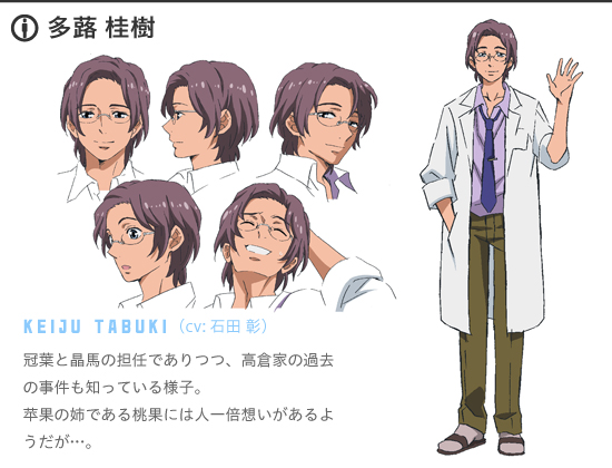 「高倉家」の「冠葉」と「晶馬」の兄第は、妹の「陽毬」の命を救った不思議なペンギン帽子の言うままに謎のアイテム「ピングドラム」を探すことになる。「ピングドラム」の所有者であるとされる女子高生「荻野目苹果」の学校をつきとめた兄弟だったが、「ピングドラム」を手に入れる作戦はなかなかうまくいかない。ペンギン帽子が妹の命を握っていることで焦る「冠葉」と「晶馬」だったが……。「苹果」の身辺を調べていくうち、彼女は兄弟の担任でもある「多蕗桂樹」のストーカーであることが分かる。実は「多蕗」は「苹果」の亡き姉「桃果」の同級生だった。趣味は野鳥観察。生態にも詳しいなかなかのマニアだ。温厚で人当たりのよさそうな好青年で、学校でも「高倉家」の事情を知った上で兄弟に接している。そんな「多蕗」は「苹果」の気持ちを知る由もなく、歌劇女優「時籠ゆり」と婚約してしまう。終始ほのぼのとしている「多蕗」だが、幼くして亡くなった「桃果」に対する気持ちを時折のぞかせることがある。その優しい性格ゆえに抱えている生きづらさもあるようだ。