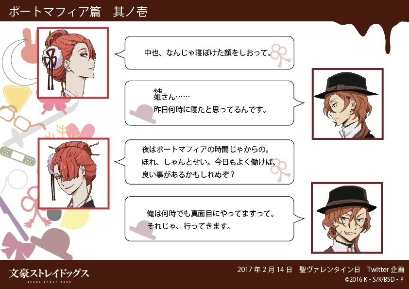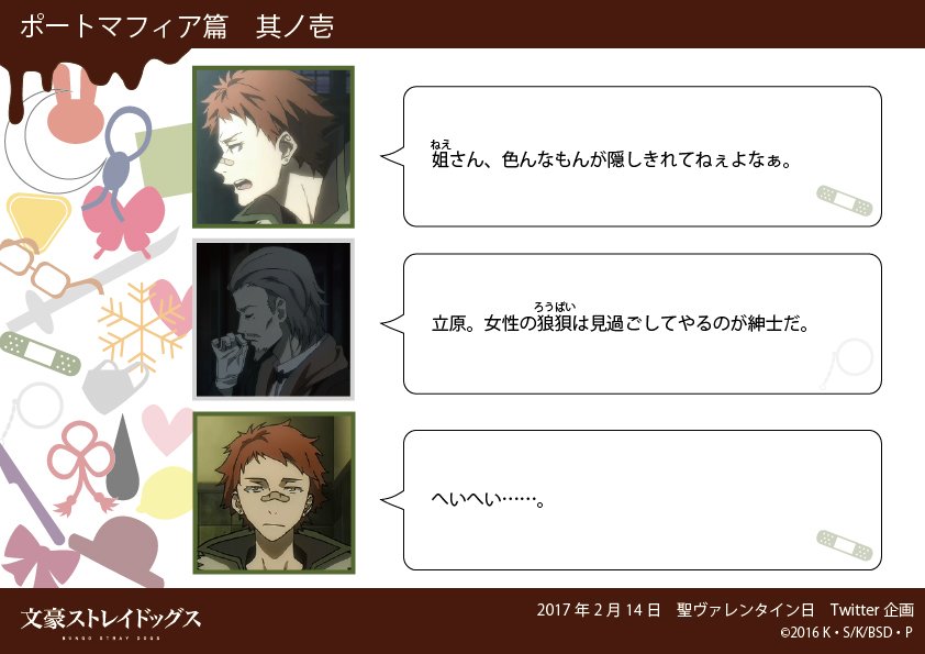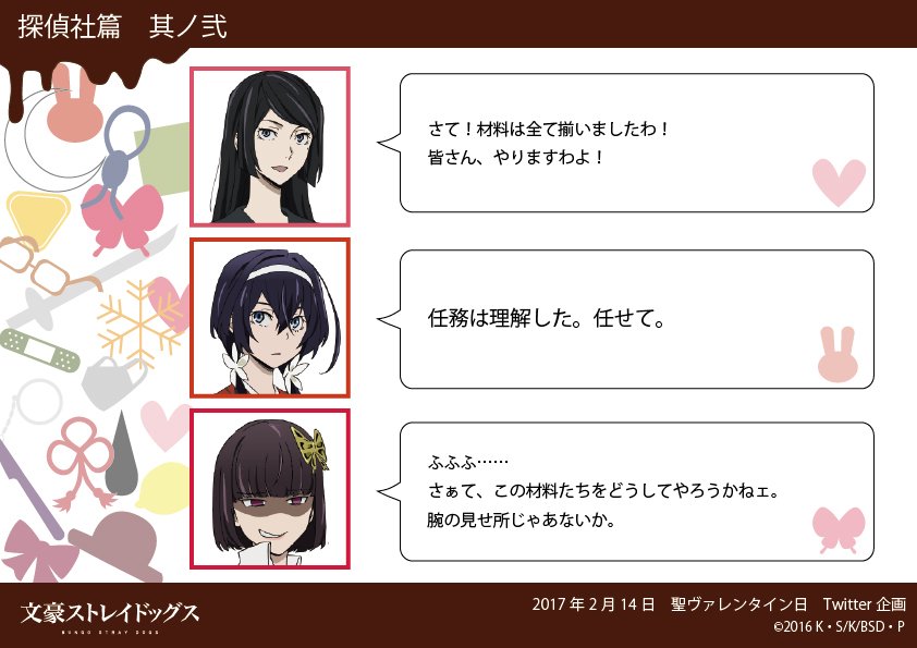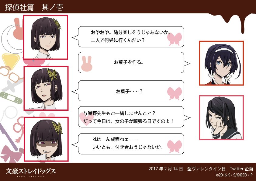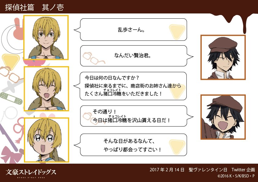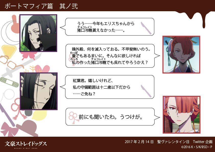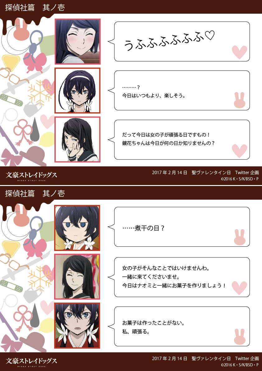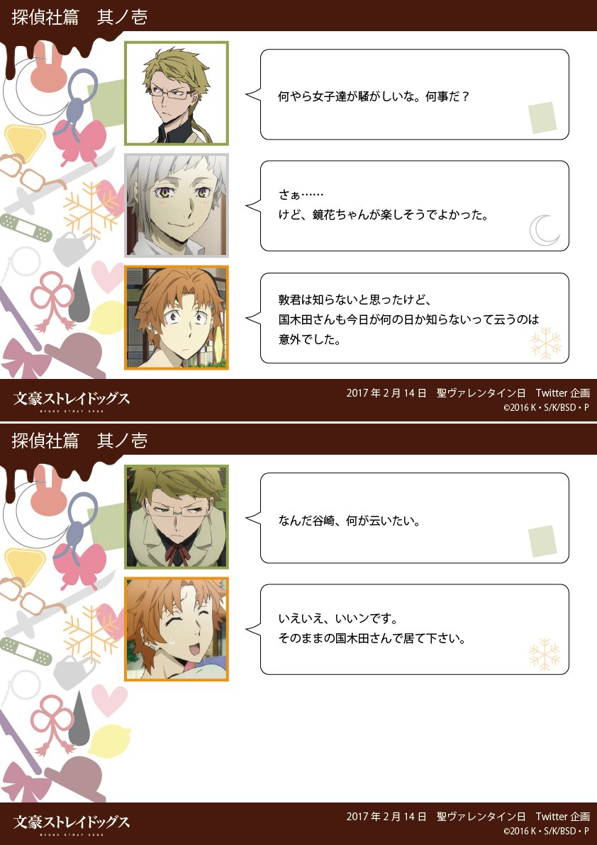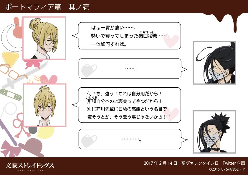 これまで、七夕、降誕祭前日譚ツイッター企画と、季節ごとにキャラクター同士の掛け合いを楽しむ企画を行っている『文豪ストレイドッグス』。今回はヴァレンタインデーに行われたTwitter企画をご紹介する。