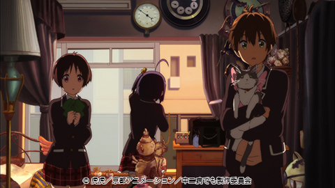 餅屋「たまや」の娘である「北白川たまこ」。髪の毛が少しぼさっとしているところが可愛い主人公である。その彼女の部屋だが、ひとつの部屋をカーテンで仕切り、あまり広くはないようだ。カーテンの向こうは、彼女の妹「あんこ」の部屋である。「たまこ」の部屋は和室で、畳に絨毯が敷かれており、壁の赤地に白い水玉模様が印象的だ。カーテンやベッド類は赤やピンクの女の子らしい色合いのものばかり。ベッドにはウサギとネズミ(ネコにも見える)のぬいぐるみとキノコ型の置時計があり、箪笥の引き出しは色とりどり。勉強机と椅子には使い込んできた年数を感じさせる。面白いのは、彼女が菱餅のクッションを持っている点だ。家が商店街にある餅屋だからだろうか、全体的にレトロな雰囲気の部屋となっている。