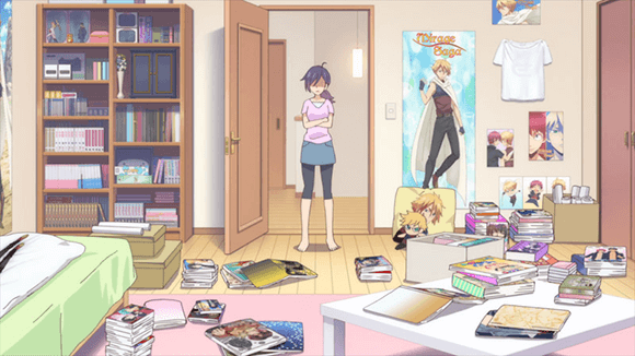 男子同士が仲良くしているのを見るのが好きなオタク女子「芹沼花依」。劇的に痩せて美少女になった途端、4人の男子にアプローチされモテ期到来の主人公だ。第2話で「花依」は赤点回避のために、勉強を教えてもらうことになった。4人が彼女の部屋に来ることになり、大掃除を開始するのだが……。彼女の部屋はピンクを基調にしており、大体の人が想像する「女の子部屋」だが、マンガやグッズ、壁にはポスター、抱き枕、同人誌などで散らかっている。人が遊びに来るので、クローゼットにあまり知られたくない本やグッズをしまいこみ、ベッドの下には彼女の推しキャラ「シオン」の店頭用POPを隠していた。淡い緑系の掛け布団をめくると、同じく「シオン」のイラストが描かれた添い寝シーツが現れたりもする。更には、「花依」が視聴していたアニメで死んだ「シオン」の仏壇が本棚に置かれ、彼女の推しキャラへの愛が十分に伝わってくるオタク部屋である。
